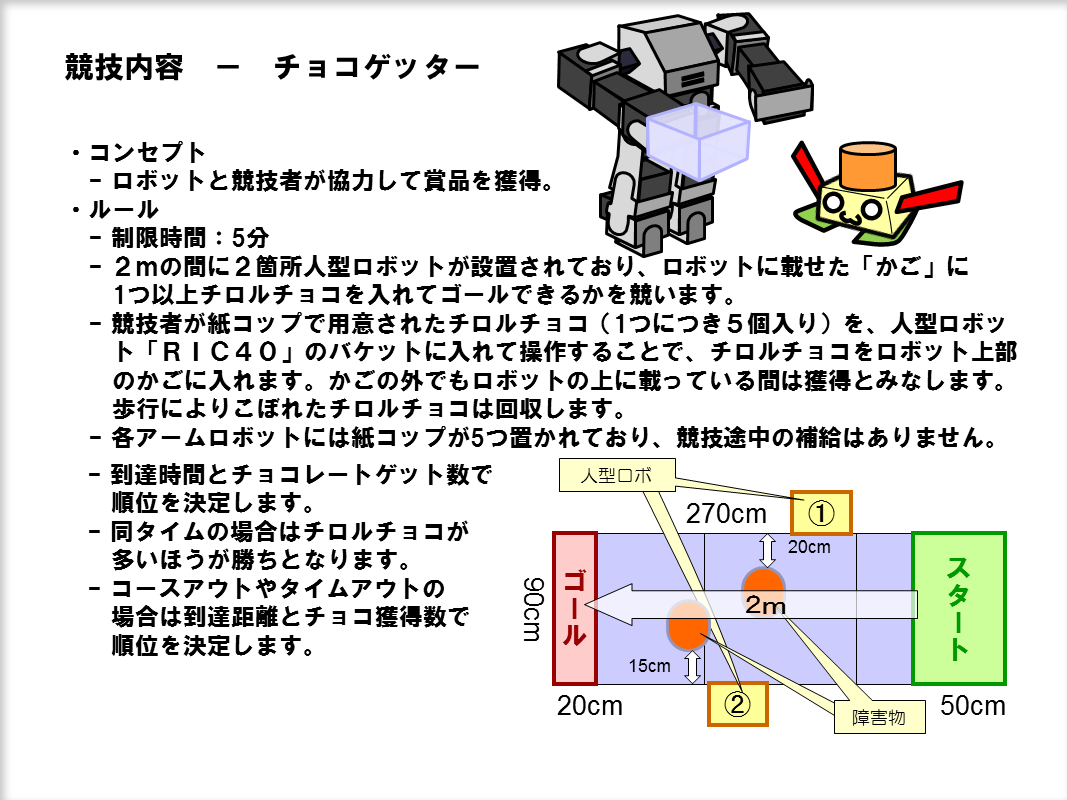 件名 : 【参加申込】チロルチョコロボット出場希望 住所 : 電子メールアドレス : ユーザー名(よみがな): (公開されます) ロボット名(よみがな): (公開されます)