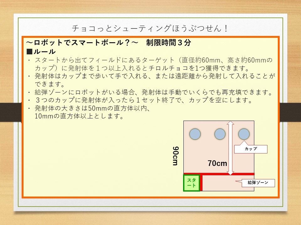 【競技】 以下の3種目の競技を2回ずつ行い、各種目の順位によってポイントを 獲得する。(進行状況により回数の調整および一部競技を割愛します) 1. 「2mゆる丘ダッシュ」 2. 「運べ、ゆらゆらチョコ転がし2」 3. 「チョコっとシューティングほうぶつせん!」 【エレガンス賞】 開催期間中、各参加ロボットの人気投票を行う。 投票数の最も多いロボットがエレガンス賞を受賞する。 【同点の扱い】 同点の場合、表彰状についてはそのままとする。 賞品については、じゃんけんの勝者が獲得する。