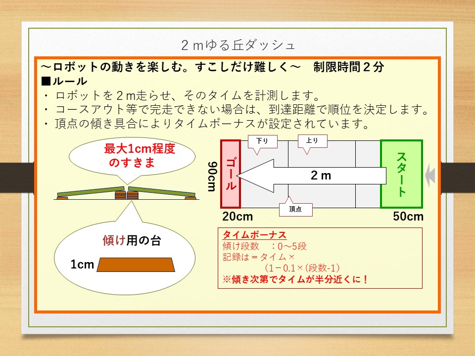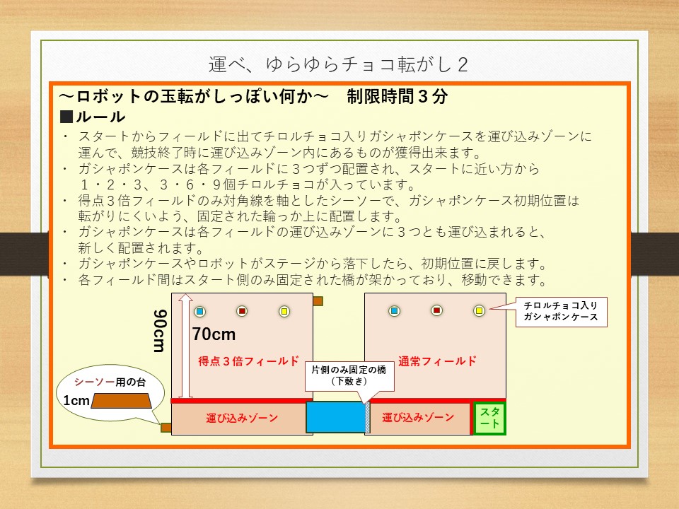 【競技】 以下の3種目の競技を2回ずつ行い、各種目の順位によってポイントを 獲得する。(進行状況により回数の調整および一部競技を割愛します) 1. 「2mゆる丘ダッシュ」 2. 「運べ、ゆらゆらチョコ転がし2」 3. 「チョコっとシューティングほうぶつせん!」 【エレガンス賞】 開催期間中、各参加ロボットの人気投票を行う。 投票数の最も多いロボットがエレガンス賞を受賞する。 【同点の扱い】 同点の場合、表彰状についてはそのままとする。 賞品については、じゃんけんの勝者が獲得する。