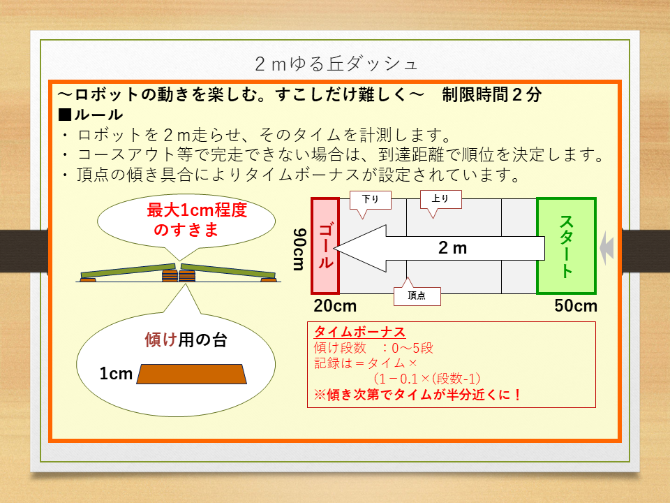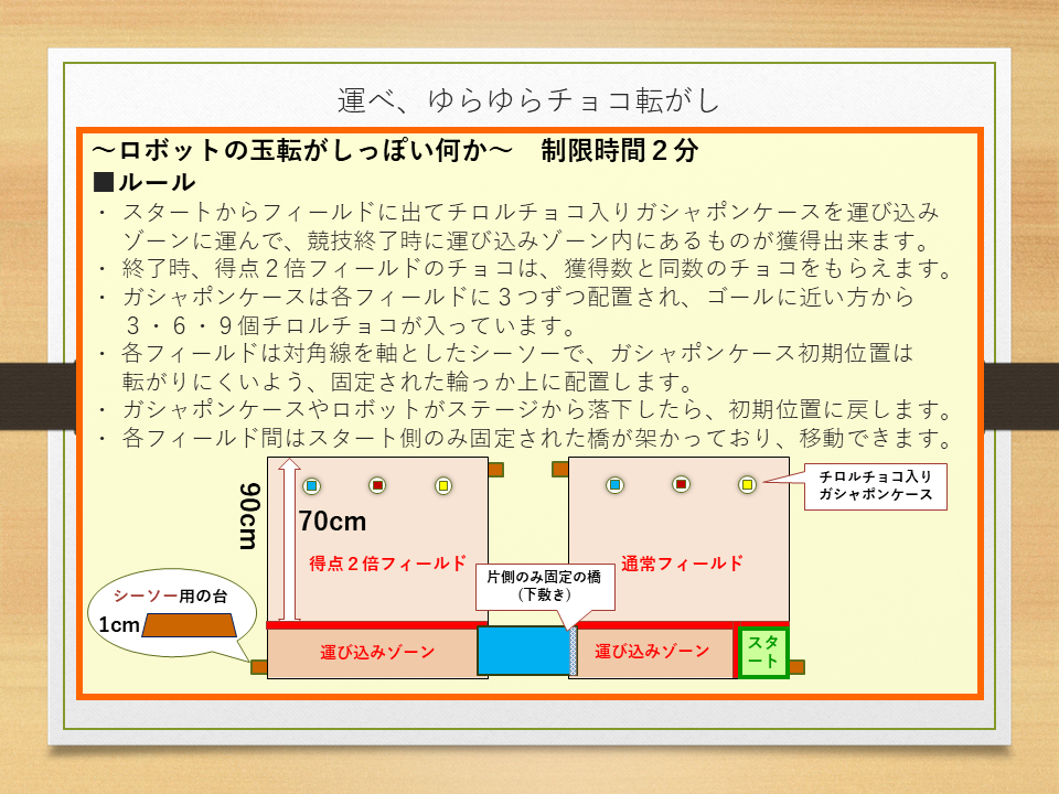 【競技】 以下の3種目の競技を2回ずつ行い、各種目の順位によってポイントを 獲得する。(進行状況により回数の調整および一部競技を割愛します) 1. 「2mゆる丘ダッシュ」 2. 「運べ、ゆらゆらチョコ転がし」 3. 「チョコっとシューティングラピッド」 【エレガンス賞】 開催期間中、各参加ロボットの人気投票を行う。 投票数の最も多いロボットがエレガンス賞を受賞する。 【同点の扱い】 同点の場合、表彰状についてはそのままとする。 賞品については、じゃんけんの勝者が獲得する。